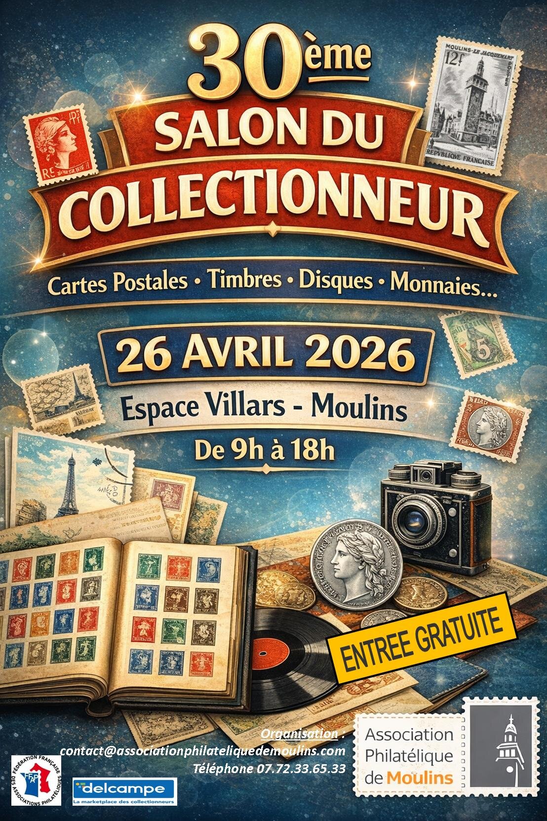 L'Association Philatélique de Moulins organise le dimanche 26 avril 2026 son 30ème Salon du collectionneur à l’Espace Villars, à proximité du Centre National du Costume de Scène, route de Montilly à Moulins (Allier).